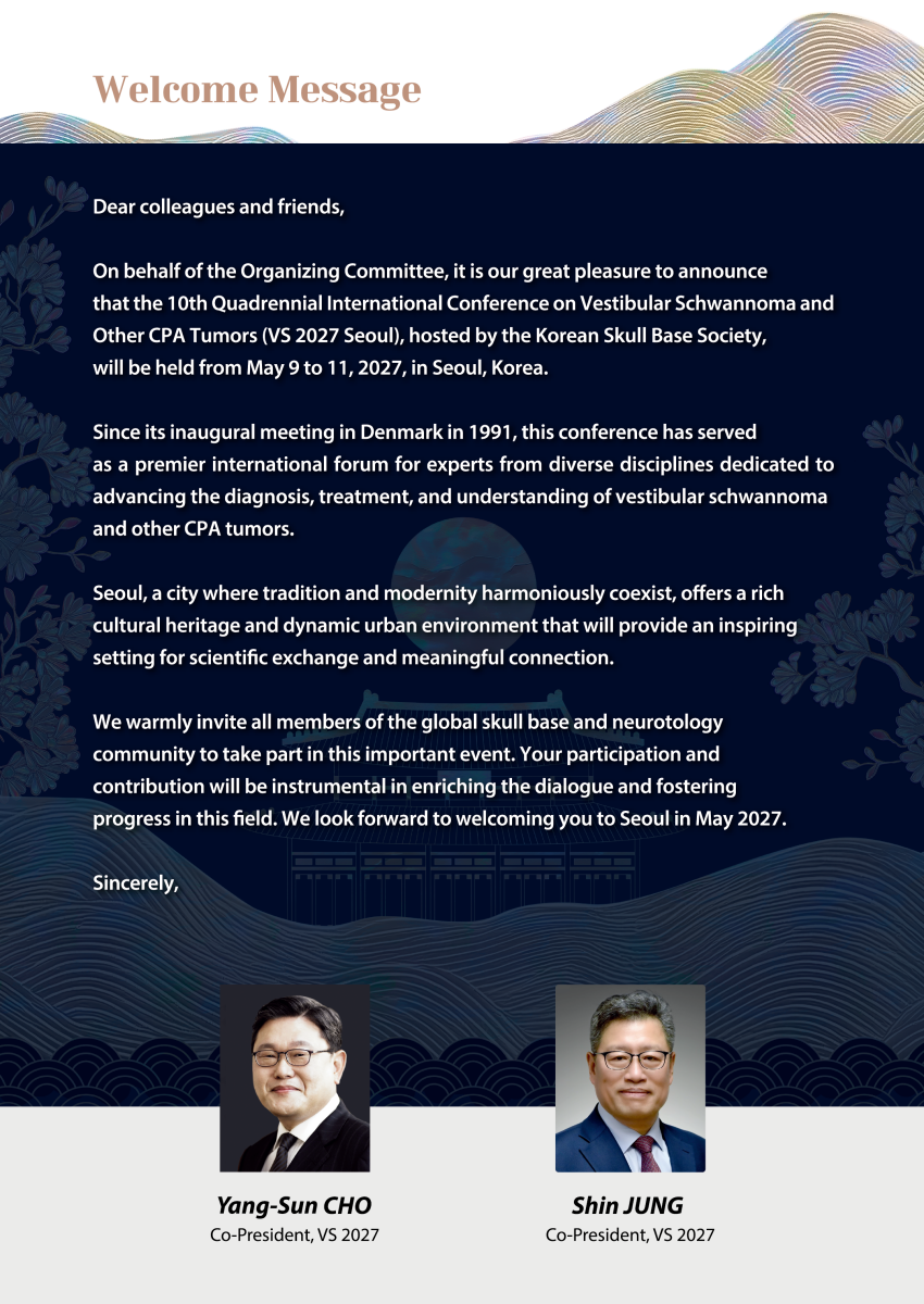 행사명: 제10차 국제청신경종양학회 (10th Quadrennial International Conference on Vestibular Schwannoma and Other CPA Tumors) 일시: 2027년 5월 9일(일) - 5월 11일(화) 장소: 코엑스 마곡 홈페이지: https://www.vs2027.org/