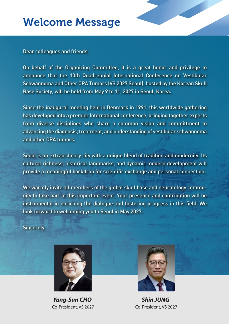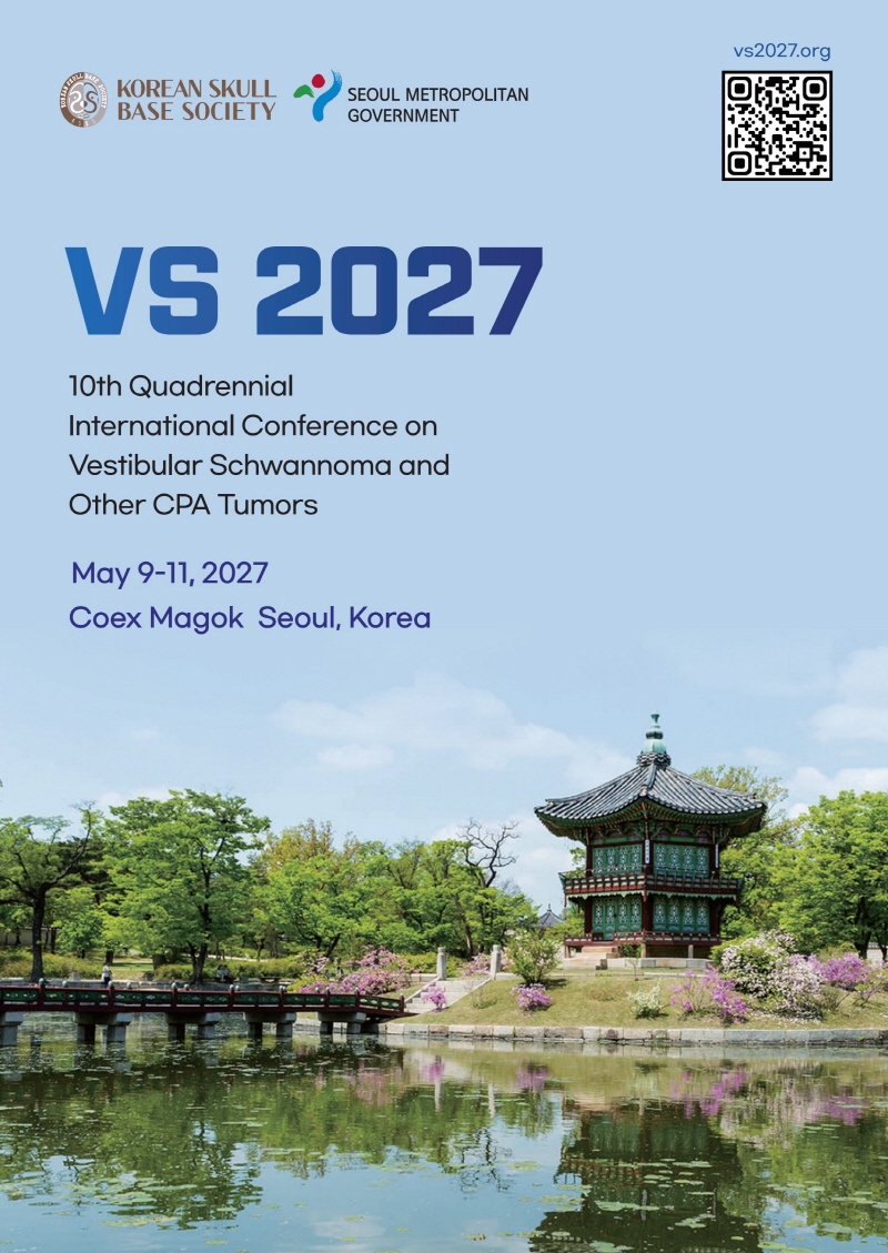 행사명: 제10차 국제청신경종양학회 (10th Quadrennial International Conference on Vestibular Schwannoma and Other CPA Tumors) 일시: 2027년 5월 9일(일) - 5월 11일(화) 장소: 코엑스 마곡 홈페이지: https://www.vs2027.org/