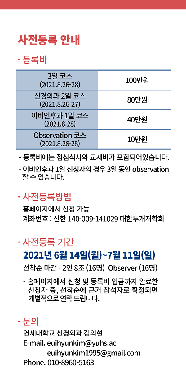 입금 계좌번호: 신한은행 140-009-141029 예금주: 대한두개저학회